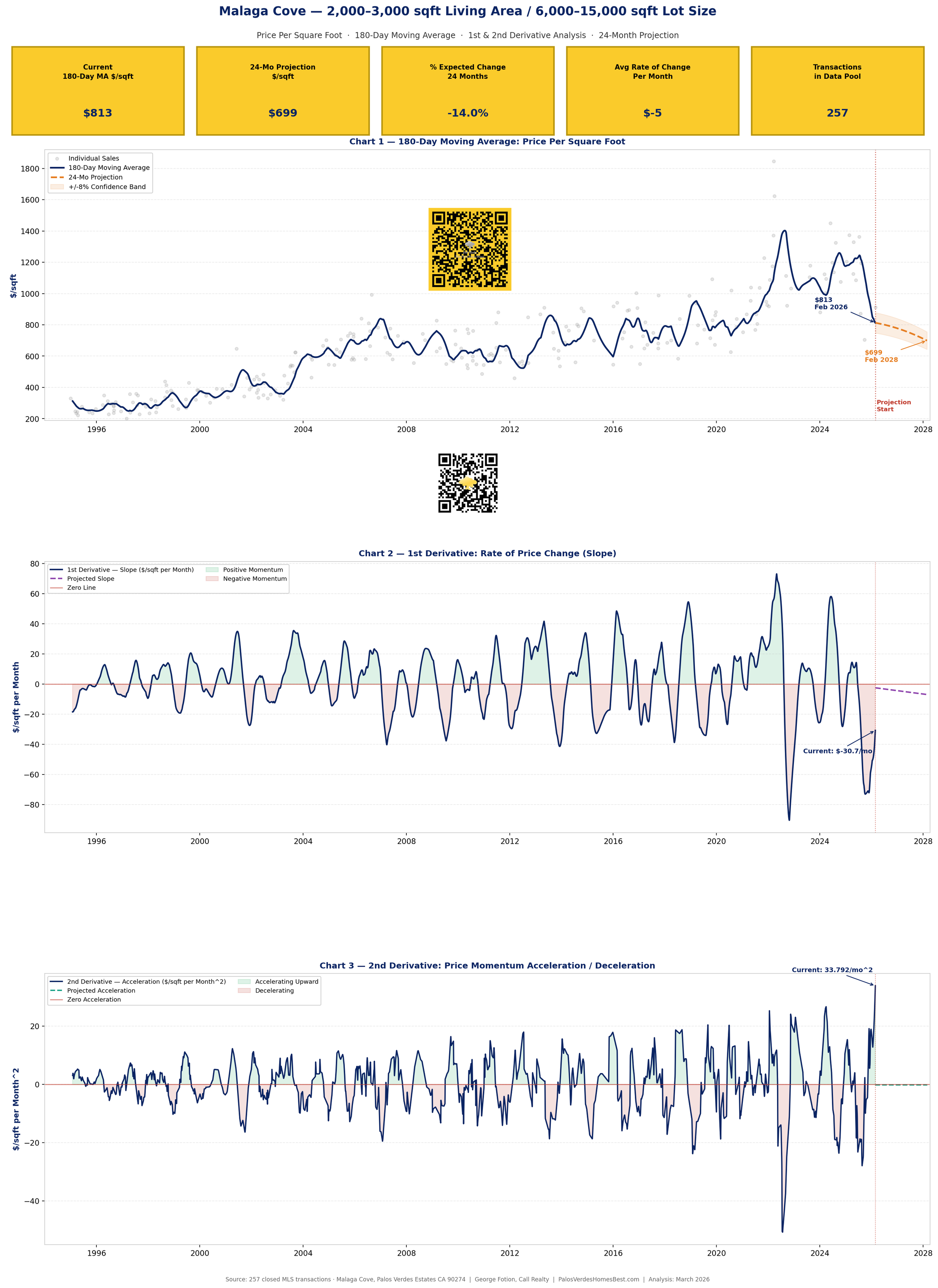 2nd Derivative (Acceleration/Deceleration): The 2nd derivative reads +$33.79 per sqft per month² — positive. Since the 1st derivative is negative, a positive 2nd derivative means the downward velocity is actually contracting. This is analogous to concave-up curvature in calculus: the function (price) is declining but bending back upward. Historically, sustained positive 2nd derivatives during price declines in Malaga Cove have preceded stabilization and eventual recovery within 12–18 months.